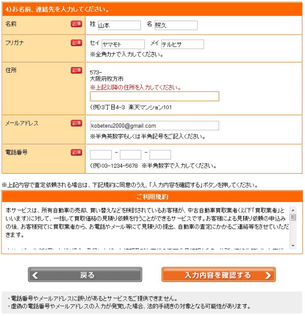 | ここの入力欄は、実際に査定に来てくださる業者の方が使用する欄となりますので、確実にご入力ください。 楽天カーサービスでの入力項目は以上で終了となります。 ここまで来ると、あとは画面右下の入力内容を確認するボタンを押してください。 すると、今まで入力した内容の確認画面が出てきますので、間違いが無いか確認しながら画面を下へスクロールしていくとこの画面に辿り着きます。 |