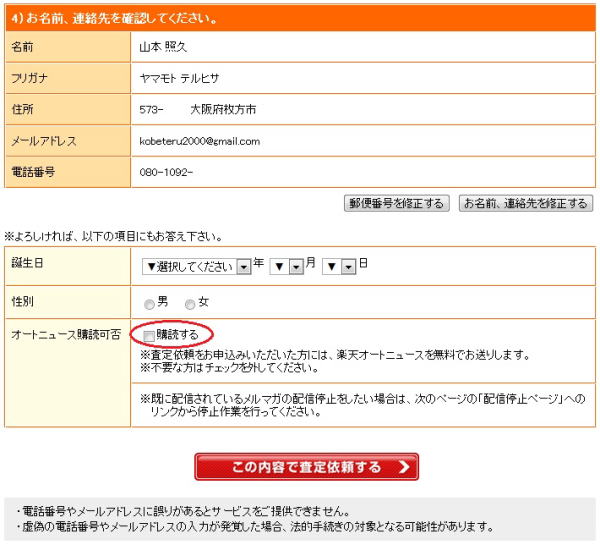 | 最後の最後に「オートニュース購読可否」というチェックボックスがあり、ご親切にチェックが入った状態になっています。もし不要の場合は、チェックボックスをクリックしてレ点を外しておきましょう。 最後に「この内容で査定依頼する」のボタンを押せば、依頼完了となります。 |