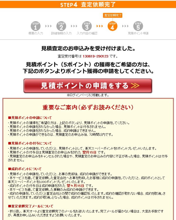 | ここまでご紹介した画面遷移が楽天カーサービス経由での査定依頼の流れとなります。 事前に準備しておけばスムーズな入力ができる物としては、車検証と走行距離のメモだけですね。 もちろん年式と車検の有効期限を覚えている方は、車検証の用意は不要です。 入力の流れはすでにイメージしていただけたと思いますので、後は実際に入力するだけです。 |