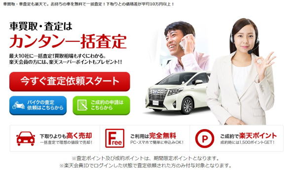 | といったパターンですね。 全てのサイトを完全に把握している訳ではありませんし、日々新しいパターンが出回りますので追従はしきれません(笑) その中でも、私が現時点で一番だと感じたのは 成約で楽天ポイント1,500円相当分プレゼント! です。※この手のサイトは特典変化が早いため、あくまでも今だけの特典だとお考えください。 ネット上には数えきれないほどの査定依頼サイトが存在していますが、査定依頼を行なうという事は個人情報を入力する事になります。 個人情報の取り扱いに対する世の中の目が非常に厳しく、何か問題が発生した時点で会社の存続に関わる時代ですから、どこのサイトでも皆様の個人情報を厳重に取り扱っている事は間違いありません。 とは言っても、やはり聞いた事のないサイトなどへ個人情報を委ねるのは気が引ける…という方がいらっしゃるのは当然の事だと思います。 そういう面も含めて、私は楽天カーサービスでの査定依頼を当ページの一押しとさせていただいております。 2012年の時点で7800万人とも言われる楽天会員の数を見れば、その個人情報の管理能力はもちろん、多くの方から支持されているのは信用するに足る相応の理由があるという事です。 後ほど詳しくご紹介いたしますが、一社のみへの査定依頼は ・査定額の正当性を精査できない ・競合がないため、査定額が上がりにくい というデメリットがありますので、最低でも2社以上の同時査定をお勧めしています。 それらを踏まえ、誰もがご存知の楽天市場が窓口をしている楽天カーサービスを当サイトではお勧めサイトとしてご紹介します。 すでに楽天会員の方からすれば、警戒心なくご活用いただけるサイトです。 私は楽天カーサービス経由で実際に査定を受けましたので、ネットの画面遷移から全てをご紹介いたします。 まずはこちらが楽天カーサービスのトップ画面となります。 |