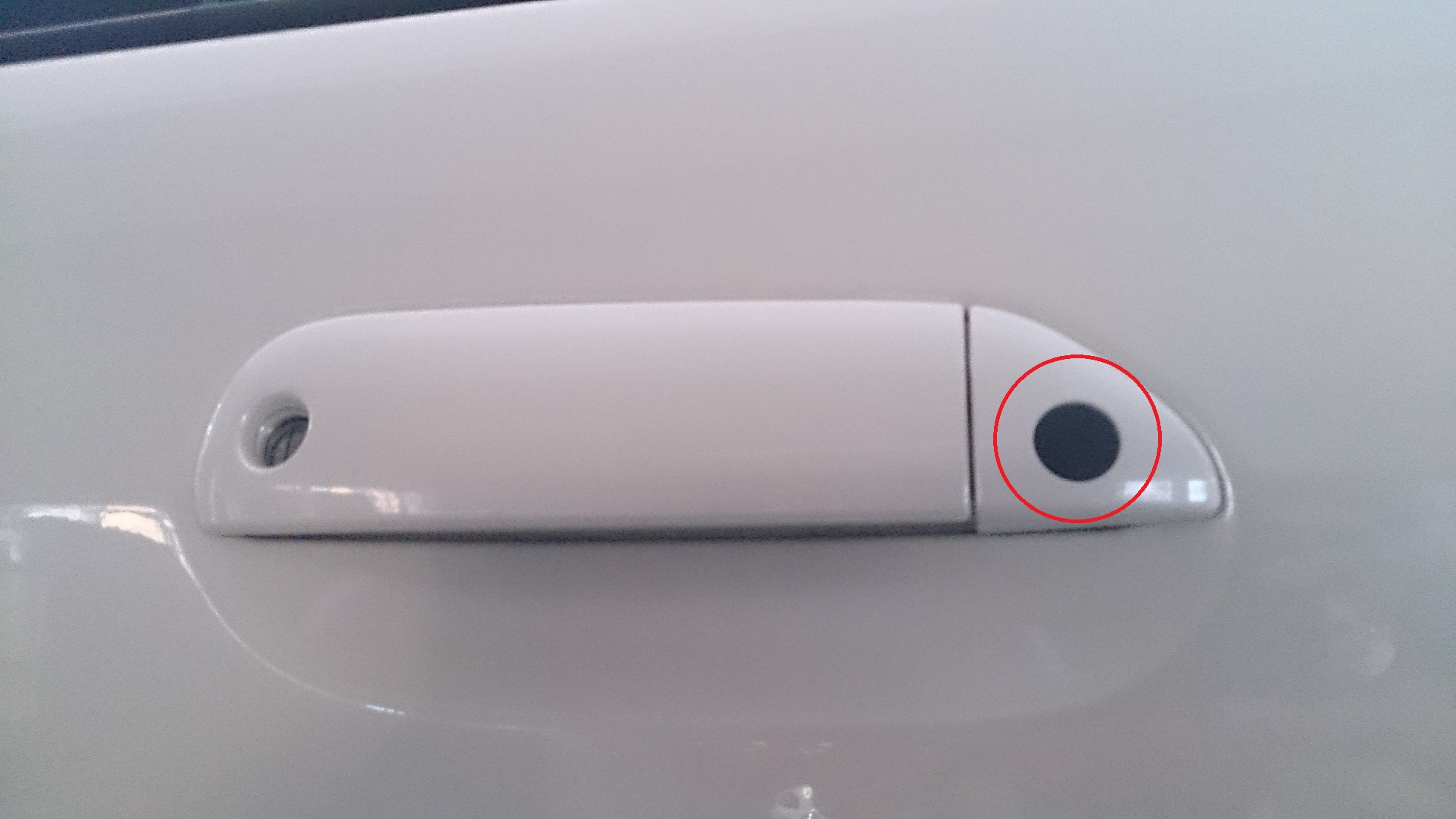 さてこの状態でドアハンドルに触れると、まず静電気(だったかな?)をドアハンドル内側にあるセンサーが感知して、車内側発信装置から信号を飛ばします。
