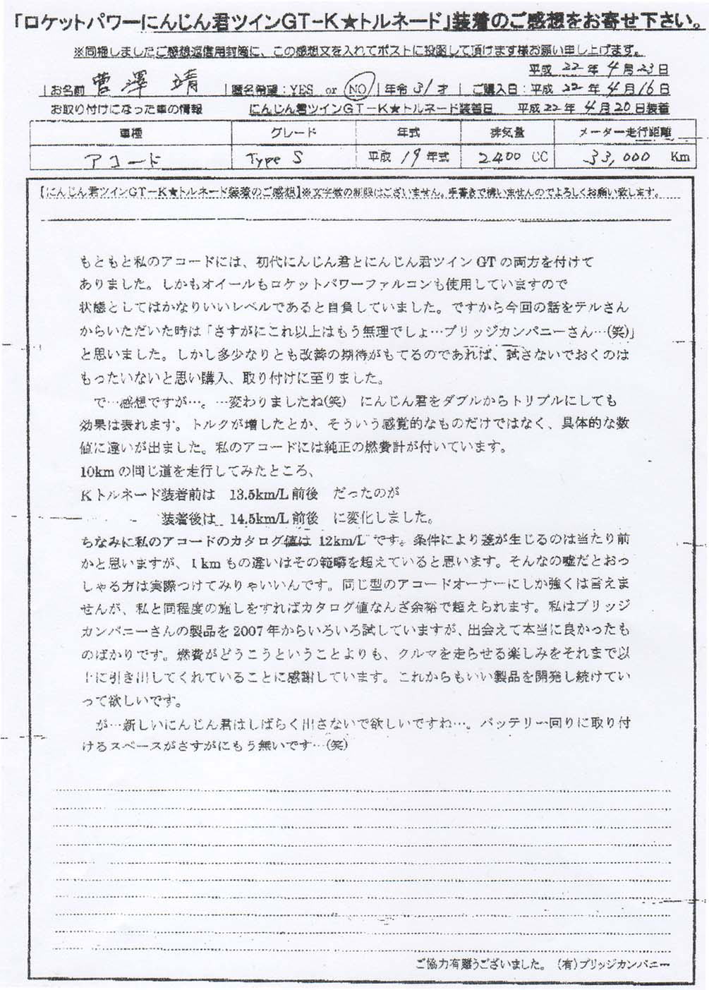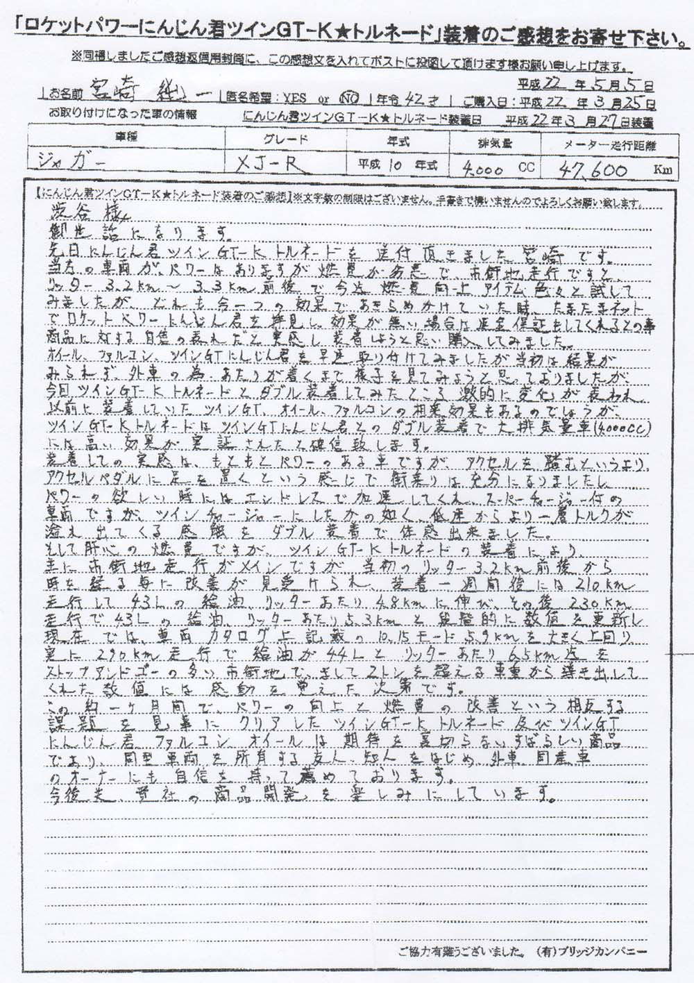 | モニター販売時に、ロケットパワーにんじん君ツインGTを開発したブリッジカンパニーの社長である大杉さんよりメッセージをいただいておりますので参考までにご覧ください。 またこの場をお借りし、お忙しい中直々にメッセージをいただいた事を深く御礼申し上げます。 |